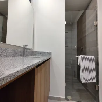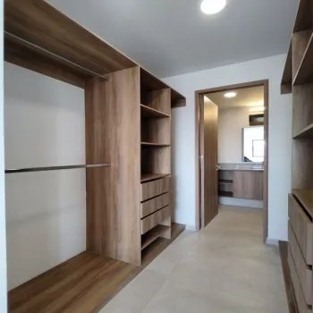 Este departamento destaca por su diseño acabados de alta calidad. La cocina integral está equipada con electrodomésticos modernos y una barra desayunadora. El vestidor ofrece amplios espacios de almacenamiento para tu comodidad.