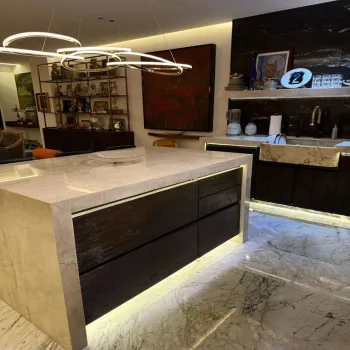 • Credenza importada a la medida junto a la cocina, con recubrimiento de mármol, iluminación empotrada e inferior y apliques de cristal de plomo importado.