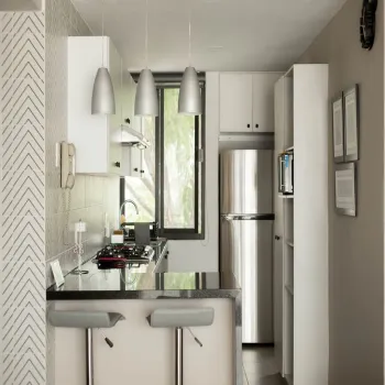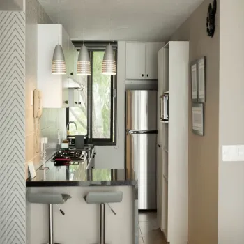 Sala-comedor con aire acondicionado, pantalla y sofá cama matrimonial. Cocina totalmente equipada con parrilla, refrigerador amplio, microondas, licuadora, cafetera y utensilios. Incluye centro de lavado con secadora.