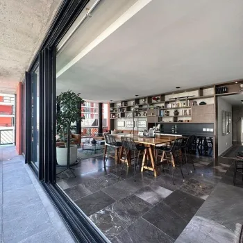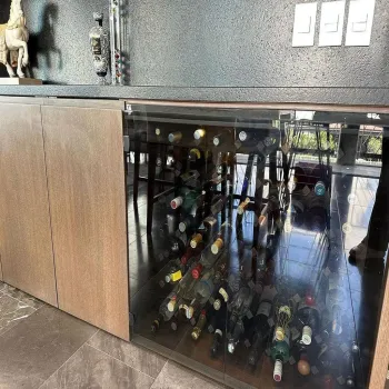 Area de sala comedor y cocina con mueble empotrado y cava