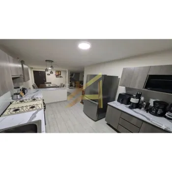 * Detalles visibles: Observa los acabados en pisos y cubiertas de cocina, así como la iluminación en los espacios. El área exterior cuenta con un espacio techado ideal para relajarse.